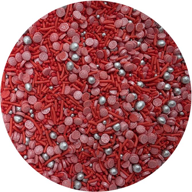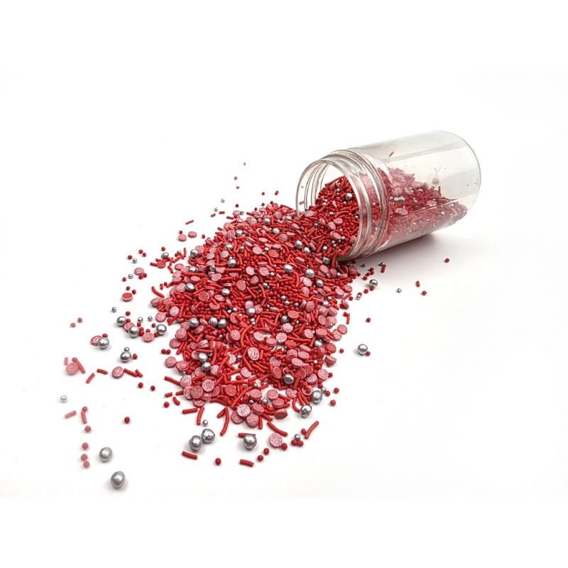 Genieße eine einzigartige Mischung aus Zuckerstreuseln in Form roter Zuckerstreifen, Konfetti und silbernen Perlen. I LOVE CAKES in verschiedenen Formen helfen dir, Muffins, Kuchen, Torten, Desserts, Cake Pops, Kekse und andere Süßigkeiten auf interessante Weise zu dekorieren. Die Streusel werden eine schöne Verzierung für Gebäck zu jeder Party, zu Jubiläen oder zu Geburtstagskuchen sein. Zuckerstreusel eignen sich gut, wenn man Süßspeisen für eine Süßspeisen-Buffet vorbereitet. Die Streusel sind in einer praktischen Dose verpackt, damit sie sich leicht dosieren und aufbewahren lassen. Bewahre sie an einem kühlen und trockenen Ort, fern von Sonnenlicht. Wenn man die Verzierung auf eine weiche Creme streut, kann Feuchtigkeit sie weicher machen. Aber Vorsicht: Wenn die Verzierung längere Zeit auf feuchter Creme liegt, kann Farbstoff aus den Streuseln auf die Cremeoberfläche gelangen. Wenn du möchtest, dass größere Teile der Dekoration beispielsweise auf einer Fondant-Torte haften, kannst du diese Art der Verzierung mit etwas festem Schokoladen- oder Zuckerguss auf Lebkuchen haftbar machen. Arbeite mit den Streuseln am besten über einer Schüssel oder einem Blech mit Rand.