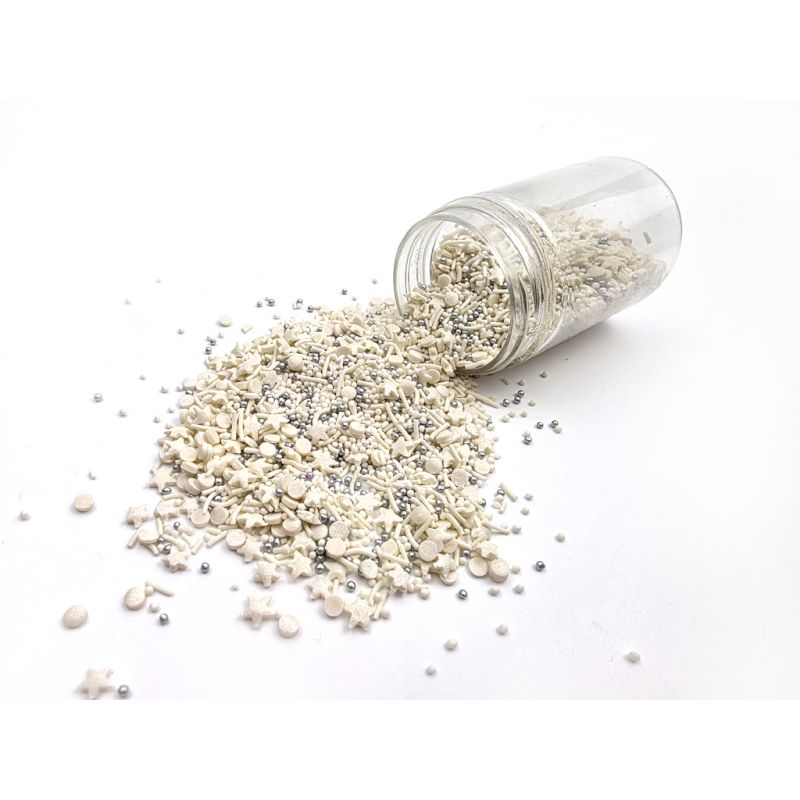 Zuckerstreusel in einer Mischung aus weißem und silbernem Mühlrand, weißen Sternchen, Streudekoration und Zuckerstangen sind eine elegante Ergänzung, die Geschmack und Aussehen Ihres Gebäcks erstaunlich verbessert. Diese weißen Zuckerkugeln sind perfekt zum Dekorieren von Kuchen, Backwaren, Muffins und Eis und verleihen ihnen einen einzigartigen Glanz und Eleganz. Jedes Packung enthält 80 g Streusel, was ausreicht, um einzigartige und köstliche Desserts zu kreieren. Verwöhnen Sie Ihre Kekse, Lebkuchen, Cake Pops und andere Süßigkeiten mit einem einzigartigen Hauch dank dieses einzigartigen Streuwerks. Wir sind sicher, dass Ihre Gäste vom Geschmack und Aussehen Ihres Gebäcks begeistert sein werden, das mit unseren Zuckerstreuseln dekoriert ist.
