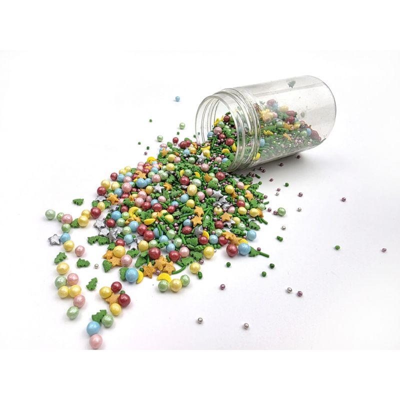 Streuen hat die Form eines Mix aus unterschiedlich großen Perlen und Tannenzweigen. Es handelt sich um eine süße Streuung aus der Reihe von einzigartigen Produkten von ILOVECAKES. Verändert den Geschmack der verzierten Produkte nicht, wird aus natürlichen Farbstoffen hergestellt und schmeckt wie Zuckerkunst. Es ist eine sehr universelle Dekoration, ideal zum Dekorieren von Cupcakes, Plätzchen, Lebkuchen, Muffins, Torten, Desserts, Backwaren, Torten, Pralinen, Trüffeln, Schokolade, Eis und vielen weiteren süßen Produkten, insbesondere solchen mit Sahne und Glasur. Es eignet sich für jeden Anlass: insbesondere für Weihnachtskuchen und Weihnachtsgebäck. In einer praktischen Schraubdose verpackt. Wenn du die Deko auf eine feuchte Creme streust, kann Feuchtigkeit vom Ganzen die Streuung erweichen. Aber Vorsicht, wenn die Dekoration längere Zeit auf feuchter Creme bleibt, kann sich sogar der Farbstoff aus der Streu lösen und dies auf der Oberfläche der Creme zeigen. Wenn du größere Teile der Dekoration beispielsweise auf einer Fondant-Torte befestigen möchtest, kannst du diese Art von Streuung mit halfester Schokolade oder Zuckerguss auf Lebkuchen befestigen. Arbeite mit der Streuung am besten über einer Schale oder einem Backblech mit Rand.