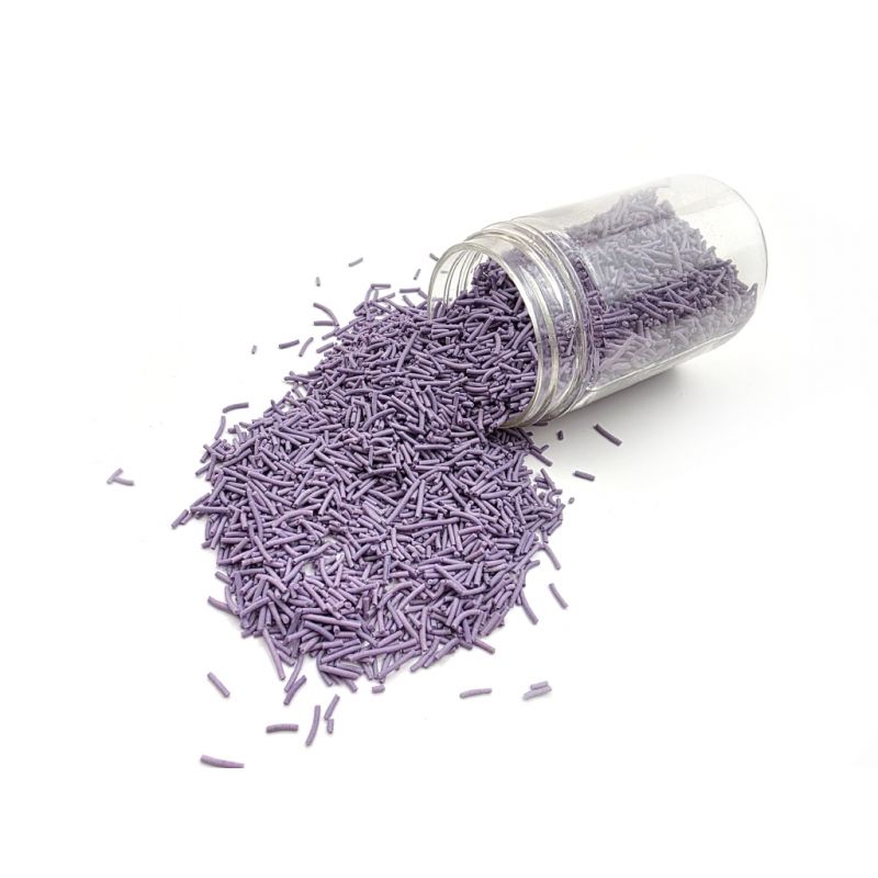 Lavendel-Süßigkeitenstangen machen Kuchen, Kekse, Cupcakes, Lebkuchen, Törtchen und Vanilleeis aus Keksen sehr elegant. Sie verleihen Desserts ein perfektes Aussehen. Sie eignen sich für jeden Anlass. Von nun an ist das Garnieren von Cupcakes und Torten noch einfacher! Sie werden auch von professionellen Konditoren zum Dekorieren von Torten und anderem Gebäck verwendet. Wir haben sie in verschiedenen Farben, Größen und Formen. Dadurch lassen sie sich leicht mit weiteren Details am Gebäck oder Dessert abstimmen. Wenn Sie die Garnierung über eine lockere Creme streuen, kann die Feuchtigkeit sie weich machen. Aber Vorsicht, wenn die Garnierung länger auf der feuchten Creme liegt, kann sich aus dem Streudekor auch Farbstoff lösen und dies auf die Oberfläche der Creme bringen. Wenn Sie möchten, dass größere Teile der Dekoration beispielsweise an der Fondant-Torte haften, können Sie diese Dekorationsart mit Zartbitterschokolade oder Zuckerguss auf Lebkuchen festkleben. Arbeiten Sie beim Streuen über einer Schüssel oder einer Backblechkante mit Rand. Wenn Sie die Garnierung über eine lockere Creme streuen, kann die Feuchtigkeit sie weich machen. Aber Vorsicht, wenn die Garnierung länger auf der feuchten Creme liegt, kann sich aus dem Streudekor auch Farbstoff lösen und dies auf die Oberfläche der Creme bringen. Wenn Sie möchten, dass größere Teile der Dekoration beispielsweise an der Fondant-Torte haften, können Sie diese Dekorationsart mit Zartbitterschokolade oder Zuckerguss auf Lebkuchen festkleben. Arbeiten Sie beim Streuen über einer Schüssel oder einer Backblechkante.