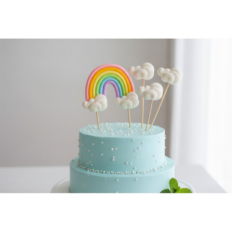Zuckerde Dekoration für Kuchen Stecknadeln Regenbogen und Wolken. Geeignet für alle Kuchentypen, enthält Sticks, dank denen man die Dekorationen einfach in den Kuchen stecken kann.