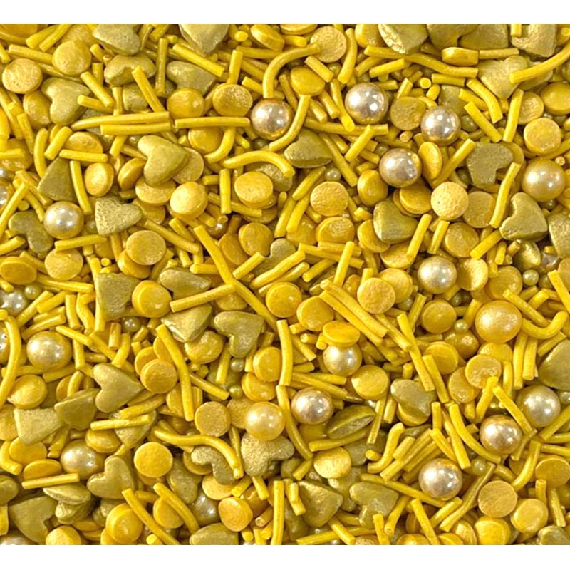 Eine Mischung aus gelben und silbernen Perlen, Herzchen und Stäbchen ist eine schöne Ergänzung für die glatte Oberfläche von Kuchen. Sie kann auch zum Garnieren von Lebkuchen, kleinen Keksen, Muffins oder Kuchen verwendet werden. Dies sind universelle Dekorationen, die Ihnen helfen, Ihrem leckeren Backwerk den letzten Schliff zu verleihen. Ein weiterer großer Vorteil dieser Zuckerperlen ist ihre einfache Anwendung. Legen Sie sie einfach auf die von Ihnen gewählte Oberfläche, und fertig. Die Perlen eignen sich wunderbar für Zuckerguss und weitere. Sie lassen sich mit verschiedenen Cremes kombinieren. Die einzelnen Dekore in dieser Mischung sind matt, schillernd oder metallisch. Sie unterscheiden sich auch in der Größe. Kleine Kuchenperlen sehen auf kleineren Kuchen und Cupcakes hübsch aus. Wenn man die Verzierung auf einen luftigen Buttercreme streut, kann die Feuchtigkeit daraus die Verzierung weicher machen. Aber Vorsicht, wenn die Verzierung längere Zeit auf feuchter Creme bleibt, kann sich aus dem Streusel auch Farbstoff lösen und dies kann die Oberfläche der Creme färben. Wenn Sie möchten, dass größere Teile der Dekoration beispielsweise auf einer Fondant-Torte haften, können Sie diese Art der Verzierung mit halbsüßer Schokolade oder Zuckerglasur für Lebkuchen aufkleben. Arbeiten Sie mit dem Streusel am besten über einer Schüssel oder einem Backblech mit Rand.