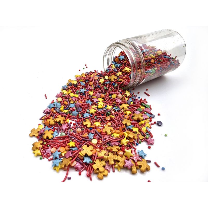 weißer Zucker, Weizenmehl, Stärkelsirup, raffiniertes Palmöl, modifizierte Stärke, Verdickungsmittel: E412, E415, E466, E414; Glanzmittel Kapol (Schellack, pflanzliches Öl), Talkum, Lebensmittel-Farbstoffe: E102, E133, E110, E124.