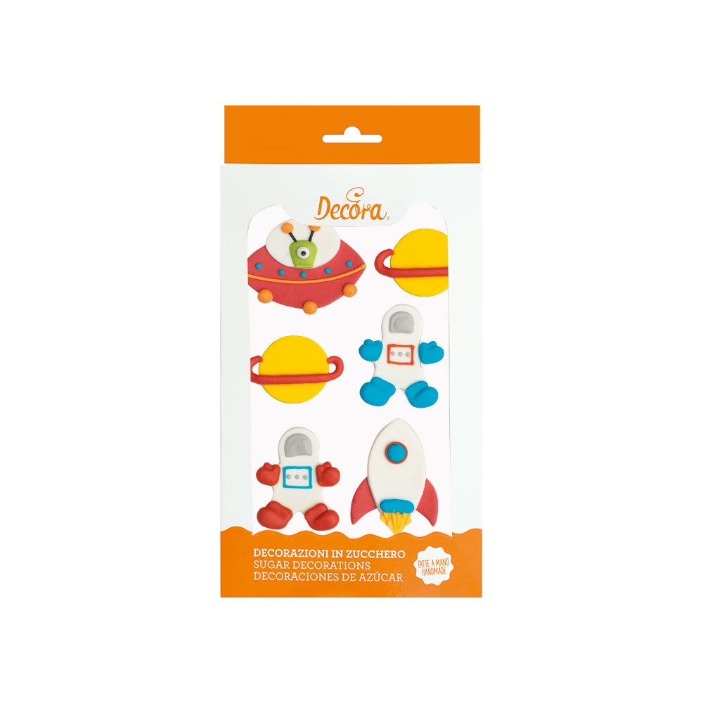 Zuckerverzierungen in Form von weltraumähnlichen Figuren, bereit für den unmittelbaren Gebrauch. Sie werden von Hand hergestellt, mit natürlichen Extraktionsfarbstoffen. Ideal zum Verzieren von Kuchen, Keksen und anderen Desserts. Diese Verzierungen sind bereits fertig; eine weitere Bearbeitung ist nicht erforderlich. Die Größe der Figuren beträgt 3-5 cm.