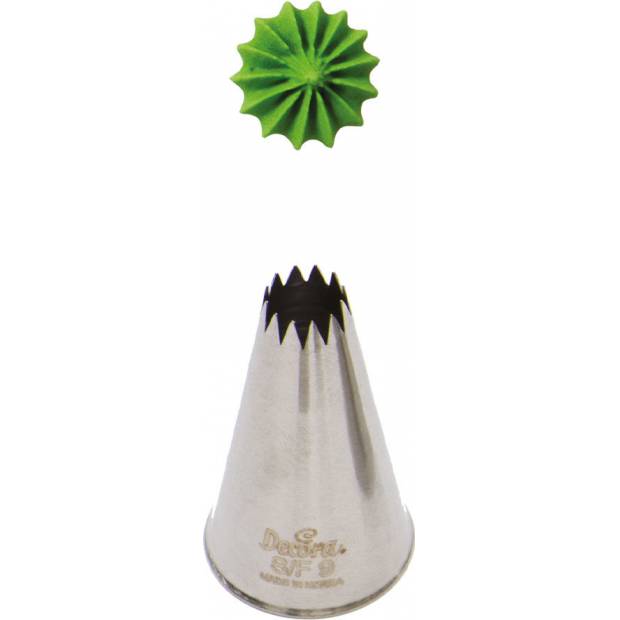 Der Metall-Verzieraufsatz für Tüllenschnitt S/F9 garantiert eine präzise und einzigartige Dekoration. Die Spitze kann wiederholt mit einer Spritztüte verwendet werden. Sie besteht aus Edelstahl, Fettflecken hinterlassen keine Rückstände auf der Oberfläche. Keine Eignung für die Spülmaschine.