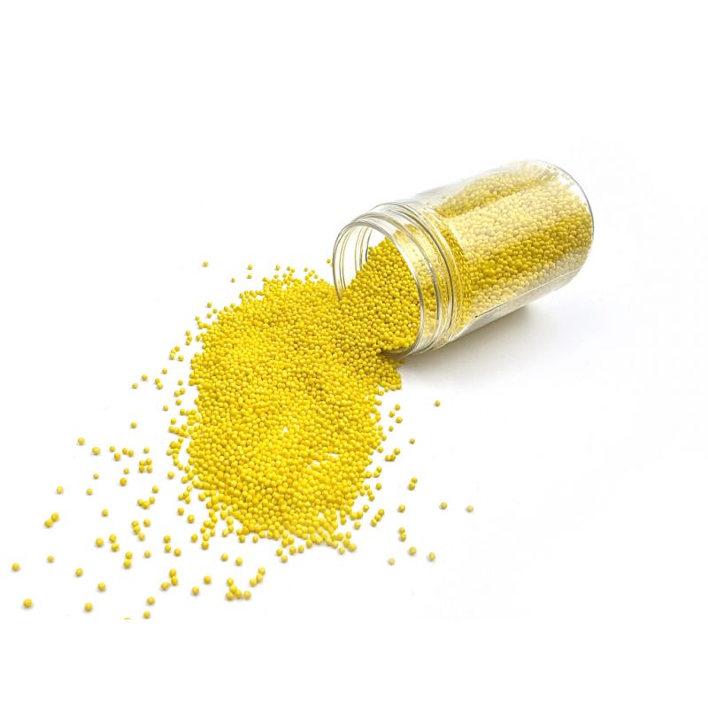 Diese gelben Perlen sind universelles Zucker-Dekor. Diese farbigen Zuckerperlen verleihen traditionellen und innovativen Backkreationen Eleganz. Hochwertige Farbstoffe garantieren Farbstabilität. Zuckerkügelchen zum Dekorieren von Torten sind eine schöne Ergänzung zu glatten Oberflächen von Torten. Sie eignen sich auch zum Verzieren von Lebkuchen, feinem Gebäck, Muffins oder Torten. Es handelt sich um universelle Dekorationen, die Ihnen helfen, Ihr leckeres Gebäck abzurunden. Ein weiterer großer Vorteil der Perlen ist ihre einfache Anwendung. Legen Sie sie einfach auf die von Ihnen gewählte Oberfläche und fertig. Perlen eignen sich perfekt für Zuckerpaste und weitere. Sie lassen sich mit verschiedenen Cremes kombinieren. In unserem Angebot finden Sie zarte Zuckerperlen, die ohne Bedenken auch mit Desserts verzehrt werden können. Wenn Sie die Verzierung über einen feuchten Creme streuen, kann die Feuchtigkeit davon den Belag weichen. Aber Vorsicht, wenn die Verzierung länger auf feuchter Creme liegt, kann sich aus dem Streudekor auch Farbstoff lösen und auf die Oberfläche der Creme gelangen. Wenn Sie möchten, dass größere Dekorteile beispielsweise auf einer Fondant- oder Doche haften, können Sie diese Art Dekoration mit Halbtrockenschokolade oder Zuckerguss auf Lebkuchenkleid aufkleben. Streuseln Sie besser über eine Schüssel oder ein Backblech mit Rand.