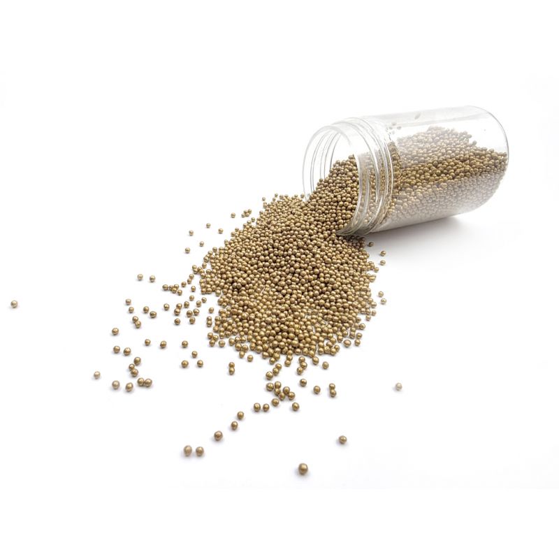 Goldene metallische Zuckerkügelchen sind eine schöne Ergänzung für glatte Oberflächen von Kuchen. Man kann sie auch zur Dekoration von Plätzchen, feinem Gebäck, Muffins oder Torten verwenden. Es handelt sich um universelle Dekorationen, die Ihnen helfen, Ihr leckeres Gebäck abzurunden. Ein weiterer großer Vorteil der Perlen ist ihre einfache Anwendung. Man legt sie einfach auf die von Ihnen gewählte Oberfläche und fertig. Die Perlen eignen sich hervorragend für Zuckerpaste und weitere. Sie lassen sich mit verschiedenen Cremes kombinieren. In unserem Angebot finden Sie feine Zuckerkügelchen, die Sie bedenkenlos auch mit Dessert verzehren können. Wenn Sie die Verzierung auf eine feuchte Creme streuen, kann die Feuchtigkeit daraus das Streuwerk etwas weicher machen. Aber Vorsicht, wenn die Dekoration länger auf der feuchten Creme liegt, könnte sich aus dem Streuwerk auch Farbstoff lösen und dieser auf die Oberfläche der Creme gelangen. Wenn Sie möchten, dass größere Teile der Dekoration zum Beispiel auf einem Überzugkuchen haften, können Sie diese Art der Dekoration mit haltextoleranter Schokolade oder Zuckerguss für Plätzchen ankleben. Arbeiten Sie mit dem Streuwerk am besten über einer Schüssel oder einem Backblech mit Rand.