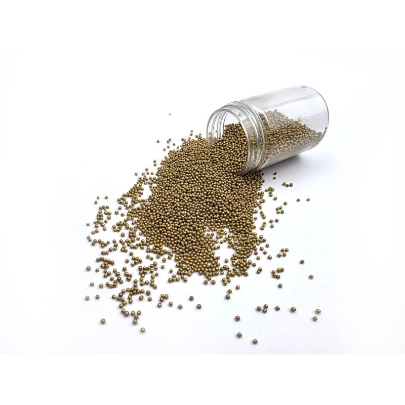 Goldene metallische Zuckerkügelchen sind eine schöne Ergänzung für glatte Oberflächen von Kuchen. Man kann sie auch zur Dekoration von Plätzchen, feinem Gebäck, Muffins oder Torten verwenden. Es handelt sich um universelle Dekorationen, die Ihnen helfen, Ihr leckeres Gebäck abzurunden. Ein weiterer großer Vorteil der Perlen ist ihre einfache Anwendung. Man legt sie einfach auf die von Ihnen gewählte Oberfläche und fertig. Die Perlen eignen sich hervorragend für Zuckerpaste und weitere. Sie lassen sich mit verschiedenen Cremes kombinieren. In unserem Angebot finden Sie feine Zuckerkügelchen, die Sie bedenkenlos auch mit Dessert verzehren können. Wenn Sie die Verzierung auf eine feuchte Creme streuen, kann die Feuchtigkeit daraus das Streuwerk etwas weicher machen. Aber Vorsicht, wenn die Dekoration länger auf der feuchten Creme liegt, könnte sich aus dem Streuwerk auch Farbstoff lösen und dieser auf die Oberfläche der Creme gelangen. Wenn Sie möchten, dass größere Teile der Dekoration zum Beispiel auf einem Überzugkuchen haften, können Sie diese Art der Dekoration mit haltextoleranter Schokolade oder Zuckerguss für Plätzchen an den Kuchen ankleben. Arbeiten Sie mit dem Streuwerk am besten über einer Schüssel oder einem Backblech mit Rand.