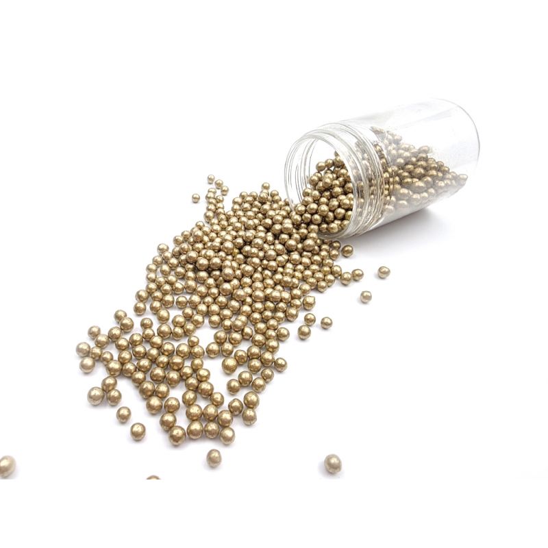 Goldene metallische Zuckerkügelchen sind eine schöne Ergänzung zu glatten Oberflächen von Kuchen. Sie lassen sich auch zur Dekoration von Plätzchen, feinem Gebäck, Muffins oder Torten verwenden. Es handelt sich um universelle Dekorationen, die Ihnen helfen, Ihr leckeres Gebäck abzurunden. Ein weiterer großer Vorteil der Perlen ist ihre einfache Anwendung. Man legt sie einfach auf die von Ihnen gewählte Oberfläche und fertig. Die Perlen eignen sich hervorragend für Zuckerpaste und weitere. Sie lassen sich mit verschiedenen Cremes kombinieren. In unserem Angebot finden Sie feine Zuckerkügelchen, die Sie bedenkenlos auch mit Dessert verzehren können. Wenn Sie die Verzierung auf eine feuchte Creme streuen, kann die Feuchtigkeit daraus das Grieschenlösen; allerdings: Wenn die Verzierung längere Zeit auf einer feuchten Creme bleibt, kann sich aus dem Streuverteil auch Farbstoff lösen und auf der Oberfläche der Creme erscheinen. Wenn Sie möchten, dass größere Teile der Dekoration beispielsweise auf einer Fondant-Torte haften bleiben, können Sie diese Art der Verzierung mit halbstarrer Schokolade oder Glacur auf Plätzchenkleiden befestigen. Arbeiten Sie beim Streuen möglichst über einer Schüssel oder einem Backblech mit Rand.