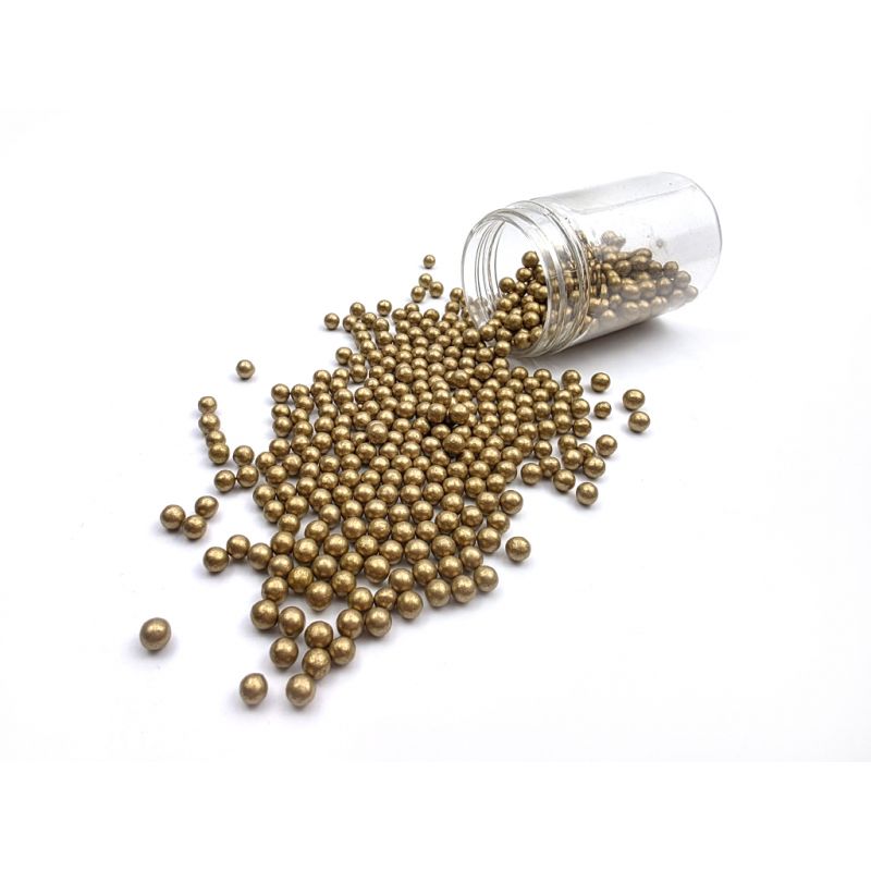 Goldene metallische Zuckerkügelchen sind eine schöne Ergänzung für glatte Oberflächen von Kuchen. Man kann sie auch zur Dekoration von Plätzchen, feinem Gebäck, Muffins oder Torten verwenden. Es handelt sich um universelle Dekorationen, die Ihnen helfen, Ihr leckeres Gebäck abzurunden. Ein weiterer großer Vorteil der Perlen ist ihre einfache Anwendung. Man legt sie einfach auf die von Ihnen gewählte Oberfläche und fertig. Die Perlen eignen sich hervorragend für Zuckerpaste und weitere. Sie lassen sich mit verschiedenen Cremes kombinieren. In unserem Angebot finden Sie feine Zuckerkügelchen, die Sie bedenkenlos auch mit Dessert verzehren können. Wenn Sie die Verzierung auf eine feuchte Creme streuen, kann die Feuchtigkeit daraus das Grieschenlösen. Aber Vorsicht, wenn die Verzierung länger auf der feuchten Creme liegt, kann sich aus dem Streuverkehr auch Farbstoff lösen und auf der Oberfläche der Creme erscheinen. Wenn Sie möchten, dass größere Teile der Dekoration beispielsweise auf einer Fondant-Torte haften bleiben, können Sie diese Art der Verzierung mit halbtrockenen Schokoladen oder Zuckerglasur für Plätzchen auf die Torte kleben. Arbeiten Sie mit dem Streugut am besten über einer Schüssel oder einem Backblech mit Rand.