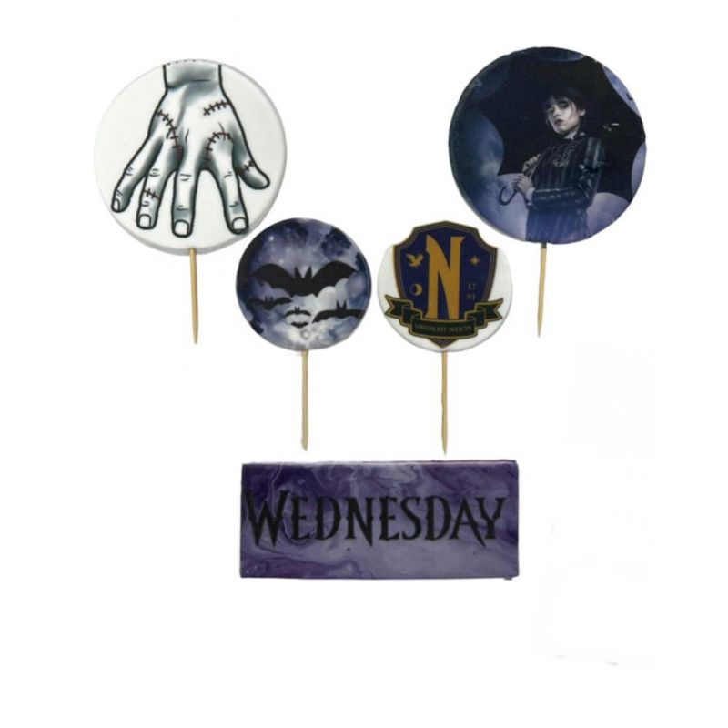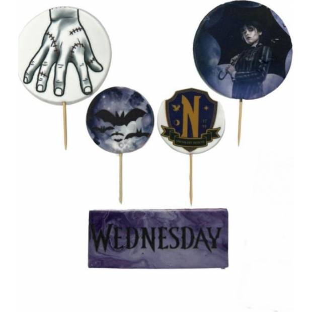 Zuckerkfigur mit dem Motiv Wednesday, ideal zum Dekorieren von kleinen und mittelgroßen Kuchen sowie anderen gelegentlichen Backwaren für Mädchen. Er ist mit einem Zahnstocher versehen, damit er einfach auf jeden Kuchen befestigt werden kann.