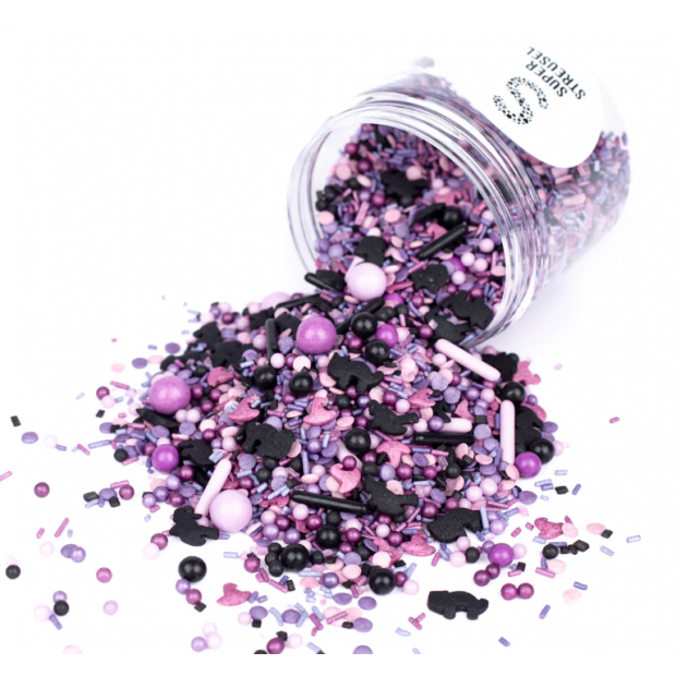 Dekorationsmischung WickedWitch von Super Streusel bringt auffällige Zuckerverzierungen in Schwarz und Lila — ideal für thematische Kuchen, Halloween oder Fantasy-Dekorationen.